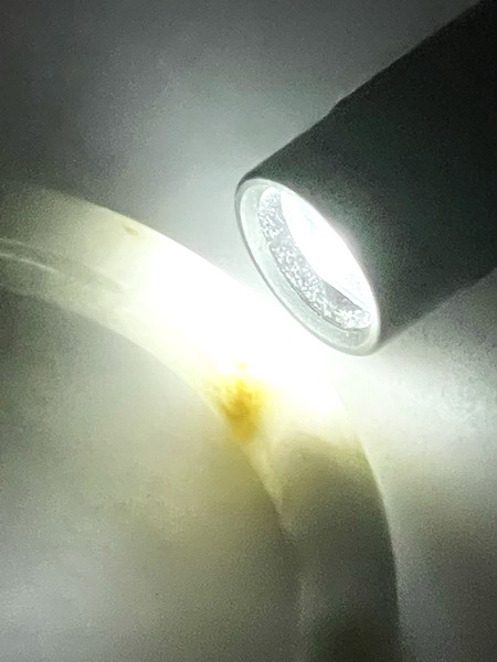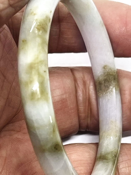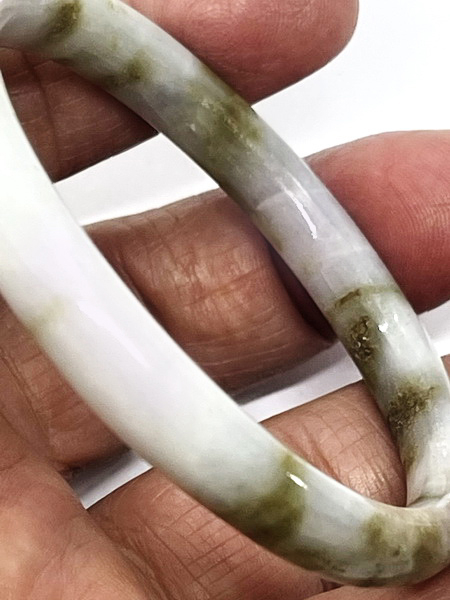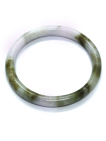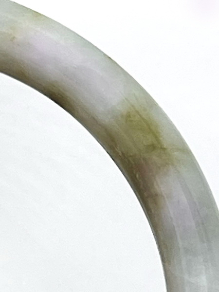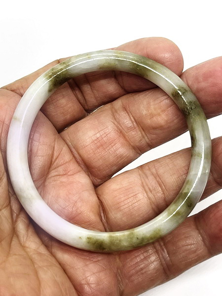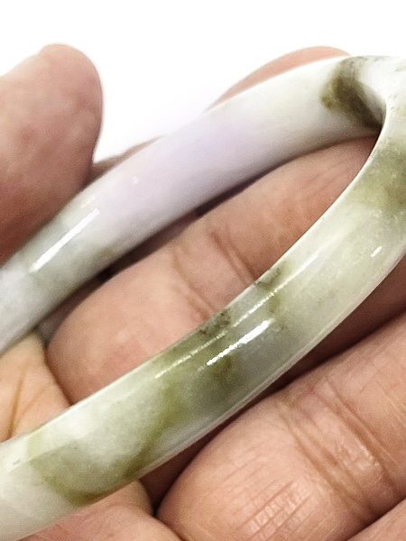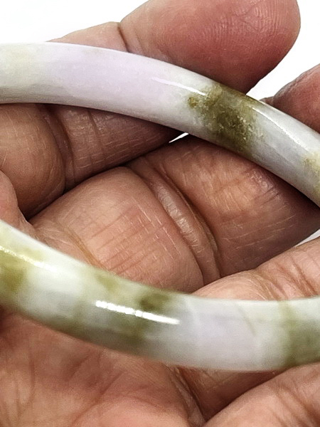 กำไลหยกสีม่วง วงนี้ เป็นหยกพม่าสองสี คือ สีขาว และสีเขียวขี้ม้า แสงลอดได้ เป็นกำไลทรงโดนัท หรือทรงมวนบุหรี่ เจไดต์ Type A ขนาดหน้ากว้าง 7.9 มม. หนา 6.6 มม. เส้นผ่าศูนย์กลางภายใน 54.9 มม.