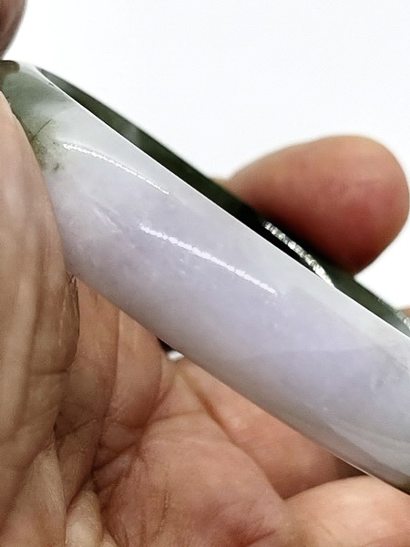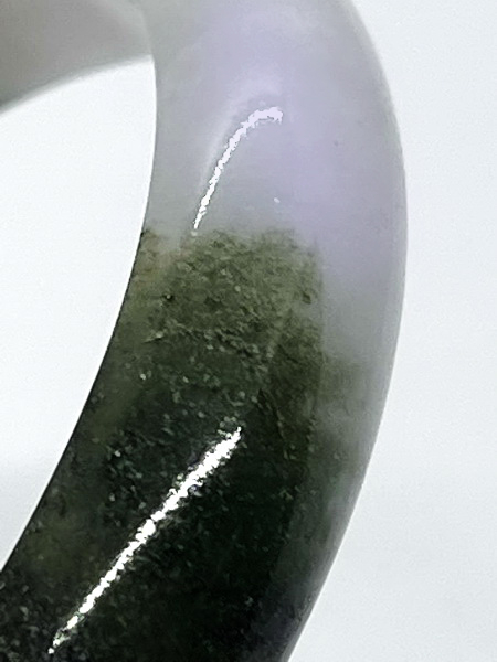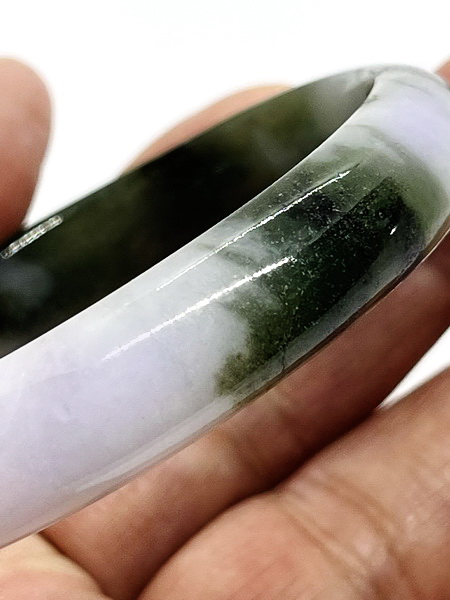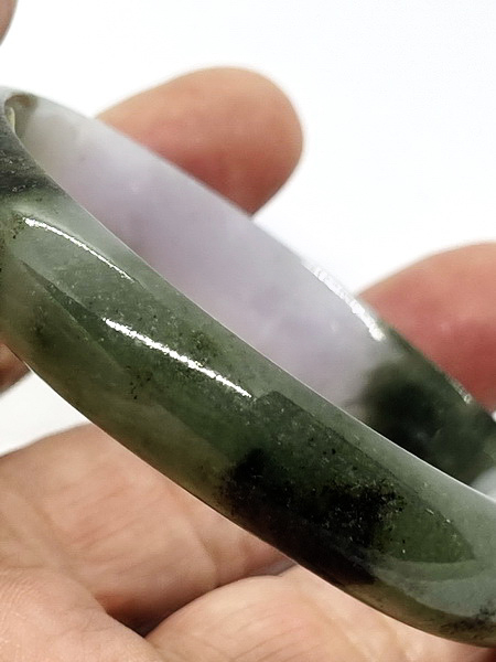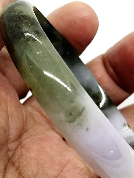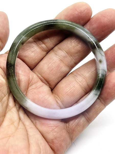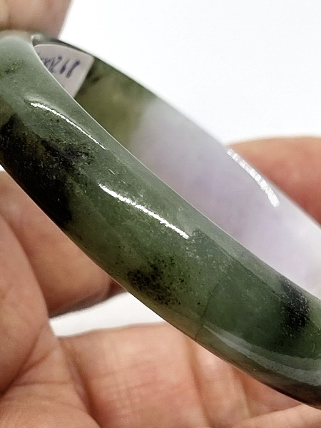 กำไลหยก วงนี้ เป็นหยกพม่าสามสี คือ สีเม่วง สีเขียว และสีดำ หน้ากว้าง 12.68 มม. หนา 6.59 มม. เส้นผ่าศูนย์กลางภายใน 56.85 มม.