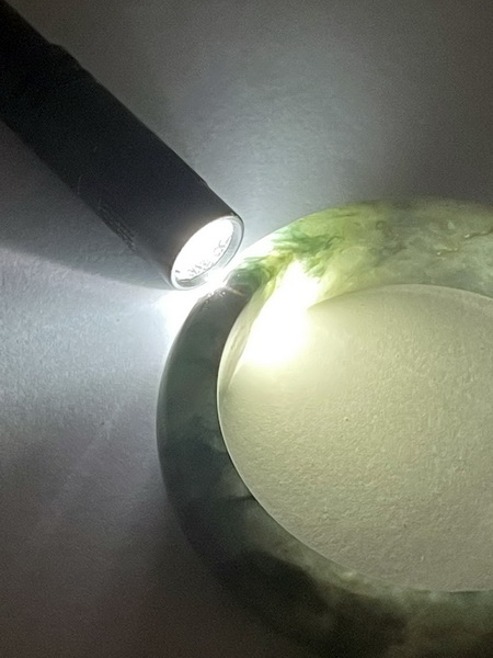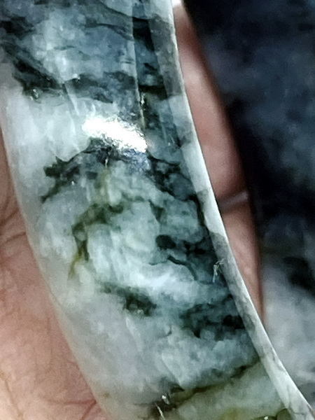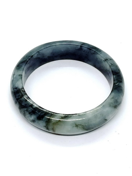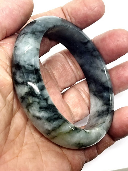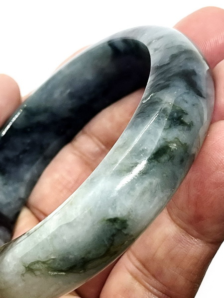 กำไลหยกพม่า วงนี้ เป็นหยกเจไดต์พม่า Type A เนื้อวุ้นกึ่งแก้วใส เป็นหยกสามสี ฮกลกซิ่ว ลายผักชี หรือ มอสอินสโนว์ พื้นเฉดสีเขียวอ่อนเฉดฟ้า ประปรายด้วยสีเขียวเข้ม และสีน้ำผึ้ง ลวดลายชัดเจน เป็นกำไลท้องปลิง แสงทะลุได้ มีขนาดหน้ากว้าง 16.3 ม.ม. หนา 8.4 มม. เส้นผ่าศูนย์กลาง 59.0 ม.ม.