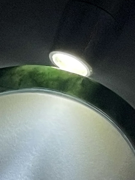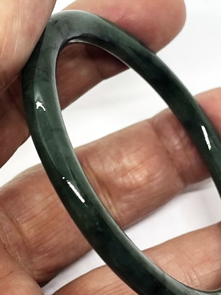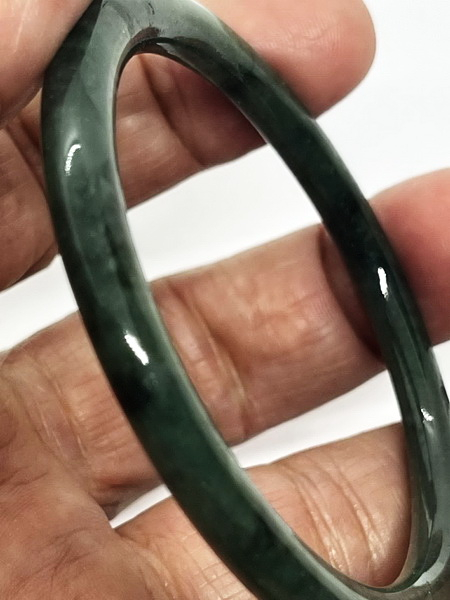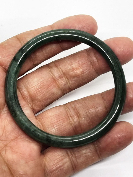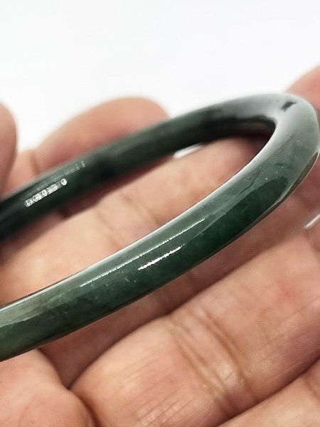 กำไลหยกพม่าวงนี้ เป็นหยกพม่า สีเขียวเข้มเต็มวง แสงลอดได้ ทรงโดนัท หรือทรงมวนบุหรี่ เป็นหยกเจไดต์ Type A มีขนาดหน้ากว้าง 5.8 มม. หนา 6.7 มม. เส้นผ่าศูนย์กลาง 56.9 มม.