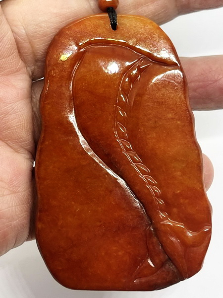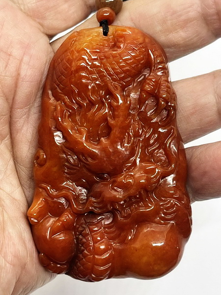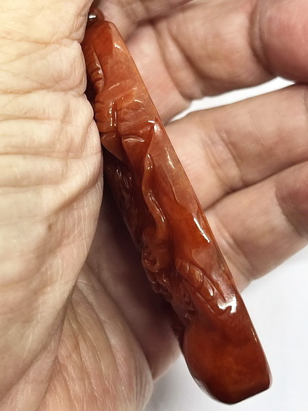 จี้หยก ชิ้นนี้ แกะจากหยกพม่าสีแดงน้ำตาล เป็นหยกเจไดต์ Type A เนื้อหยกไม่ตัน แสงลอดผ่านได้ แกะเป็นมังกรทรงเหลี่ยม เนื้อหยกเนียนมันเงาสวย เจไดต์ Type A มีขนาดกว้าง 48.4 มม. สูง 74.9 มม. หนา 12.0 มม.