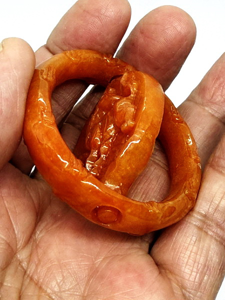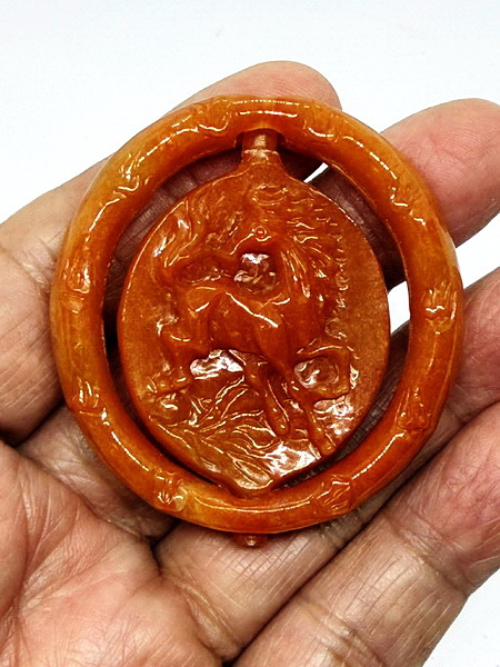 จี้หยก ชิ้นนี้ แกะจากหยกแดงพม่าเกรดพรีเมี่ยม แกะเป็นม้าในห่วง หมุนได้ เป็นหยกชิ้นเดียวกัน เนื้อหยกเงางาม เป็นหยกเจไดต์ Type A มีขนาดกว้าง 52.2 มม. ยาว 54.5 มม. หนา 10.4 มม.