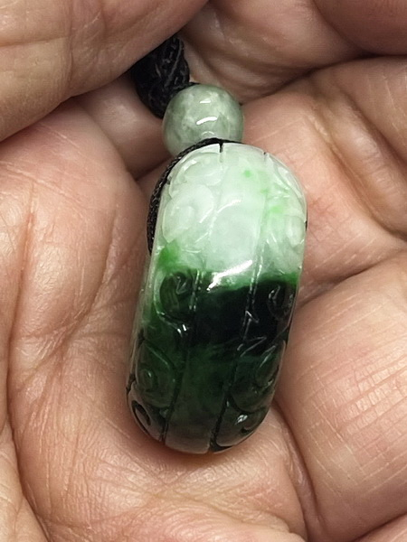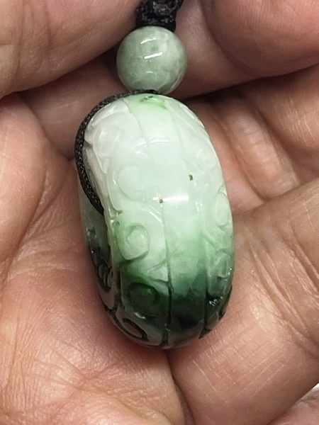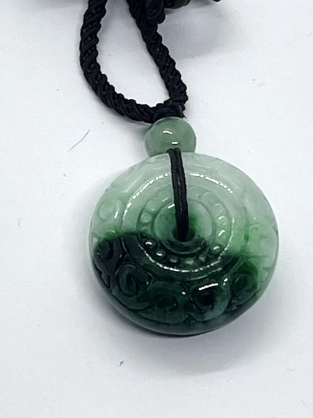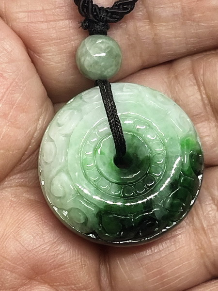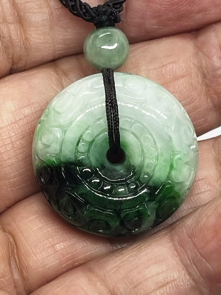 จี้เหรียญหยกพม่านี้ เป็นหยกพม่าสองสี คือสีเขียว และสีขาว เป็นหยกเจไดต์ Type A เนื้อพรีเมี่ยม มันเงา แสงลอดได้ แกะลายเถาวัลย์ มีขนาดผ่าศูนย์กลาง 27.3 ม.ม. หนา 12.6 ซ.ม. ร้อยด้วยเชือกสีน้ำตาล ประดับด้วยเม็ดหยกขนาด 7.6 มม.