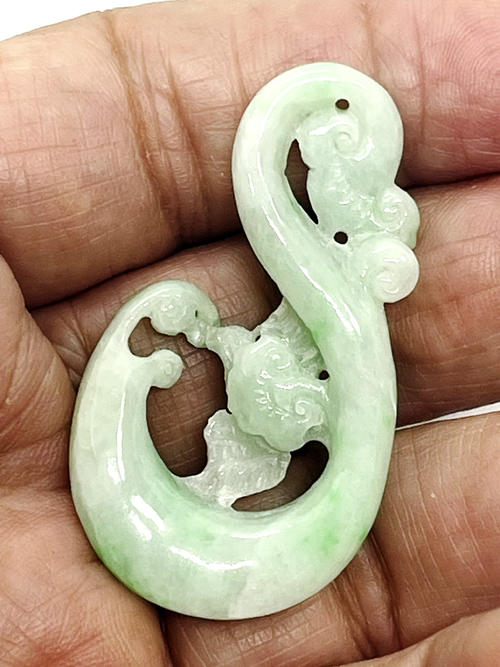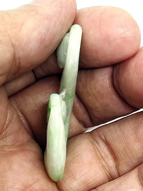 จี้เหรียญหยกสองสีพม่านี้ เป็นหยกพม่า แกะเป็นนกกำลังดูดน้ำหวานจากดอกไม้ พื้นสีเขียวอ่อน นกเป็นหยกสีเขียวกรีนแอปเปิ้ล มีขนาดกว้าง 26.79 มม. สูง 47.3 มม. หนา 7.62 มม.