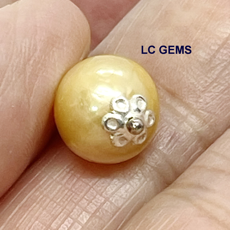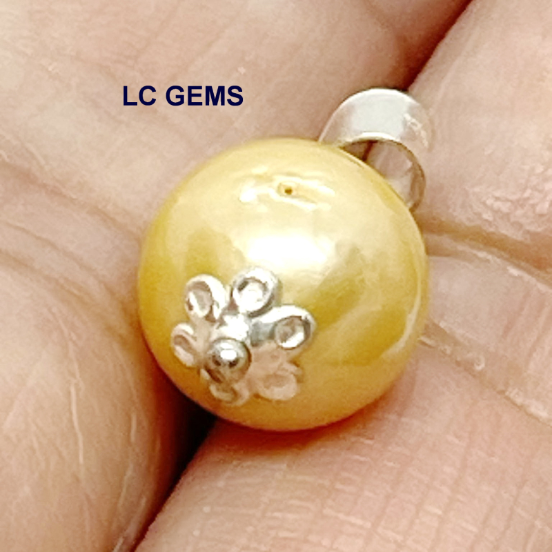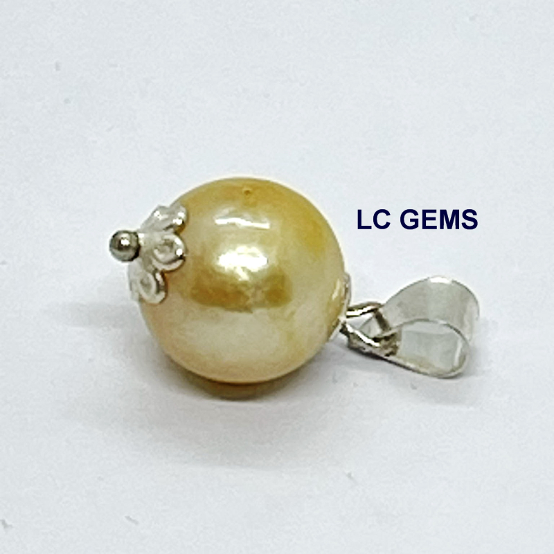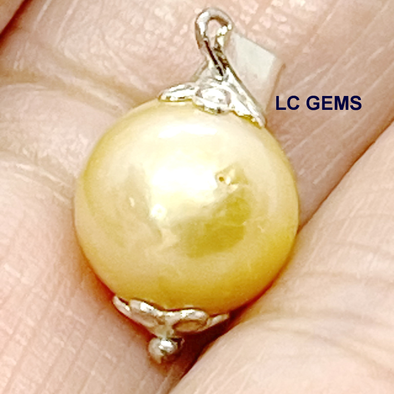 จี้มุก ชิ้นนี้ เป็นไข่มุกแท้สีทองจากทะเลจีนใต้ มีขนาด 10.65 มม. เป็นห่วงเงินแท้ วัสดุประดับเงินแท้