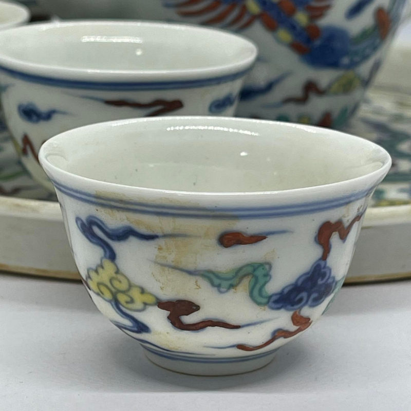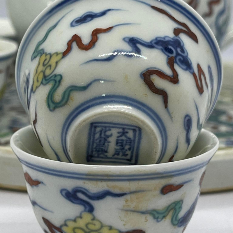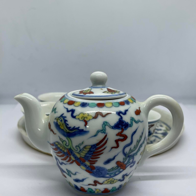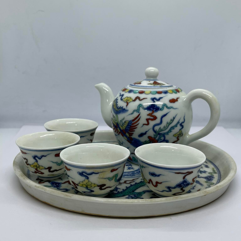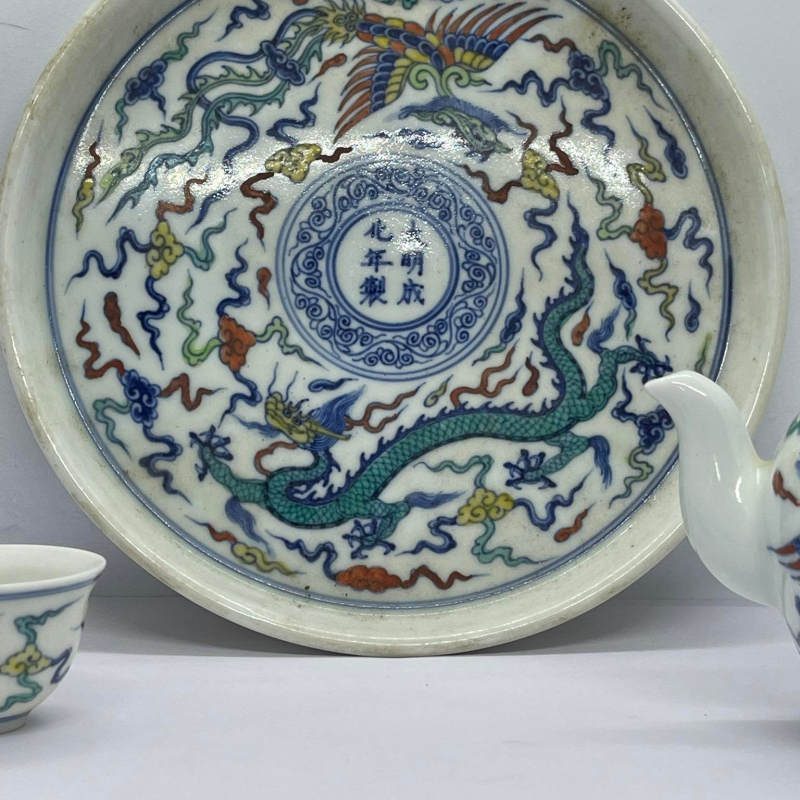 ชุดกาน้ำชากระเบื้องจีน ชุดนี้มี เป็นชุดกาน้ำชาจีนโบราณ ระบุผลิตในสมัยจักรพรรดิ์เฉินฮว่า จักรพรรดิ์องค์ที่ 9 แห่งราชวงศ์หมิง พื้นกระเบื้องมีสีขาว ลวดลายมังกรและหงส์ พร้อมกล่องสวยงาม