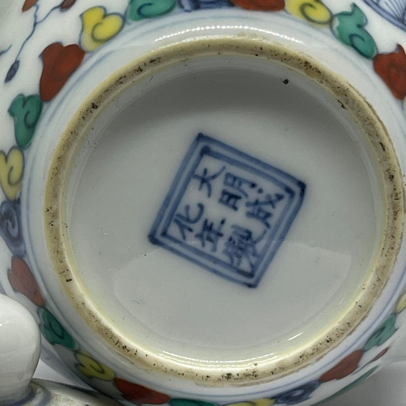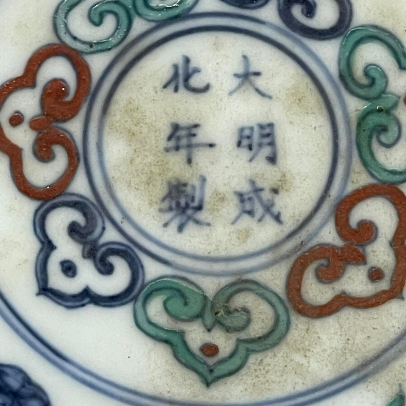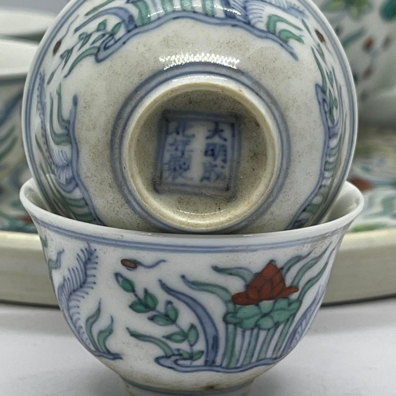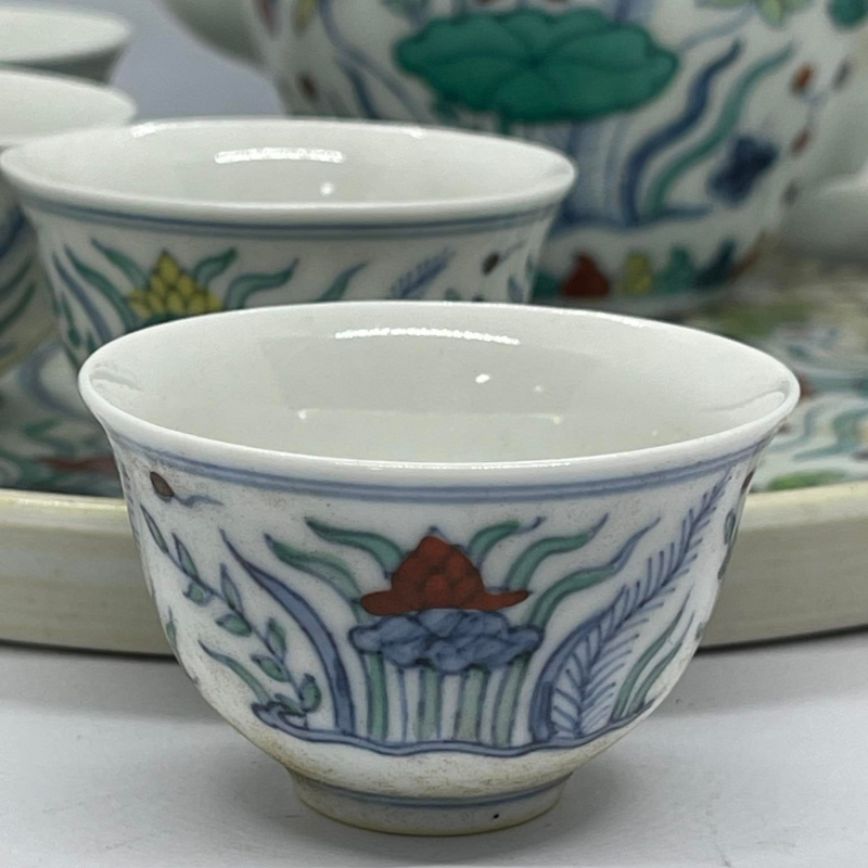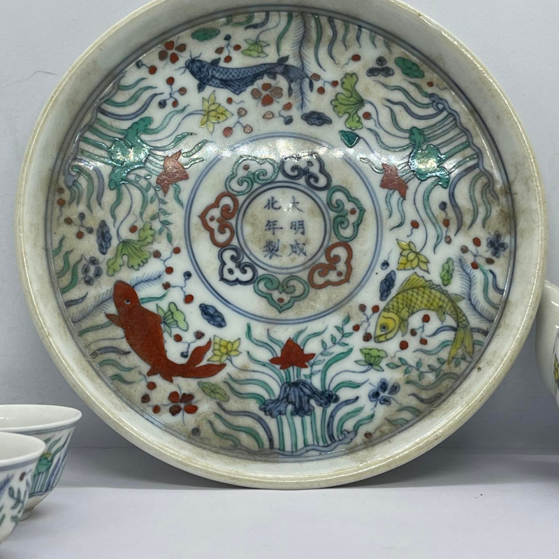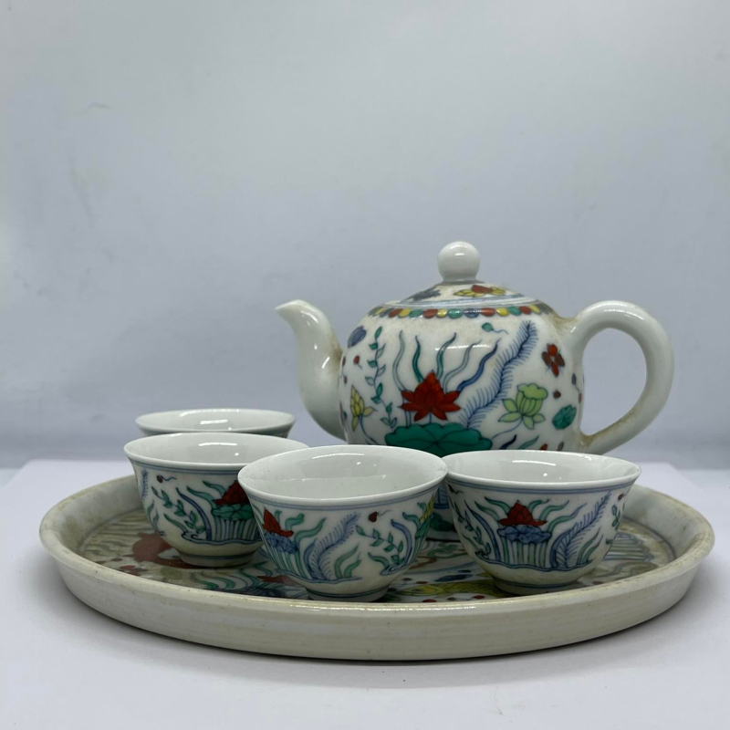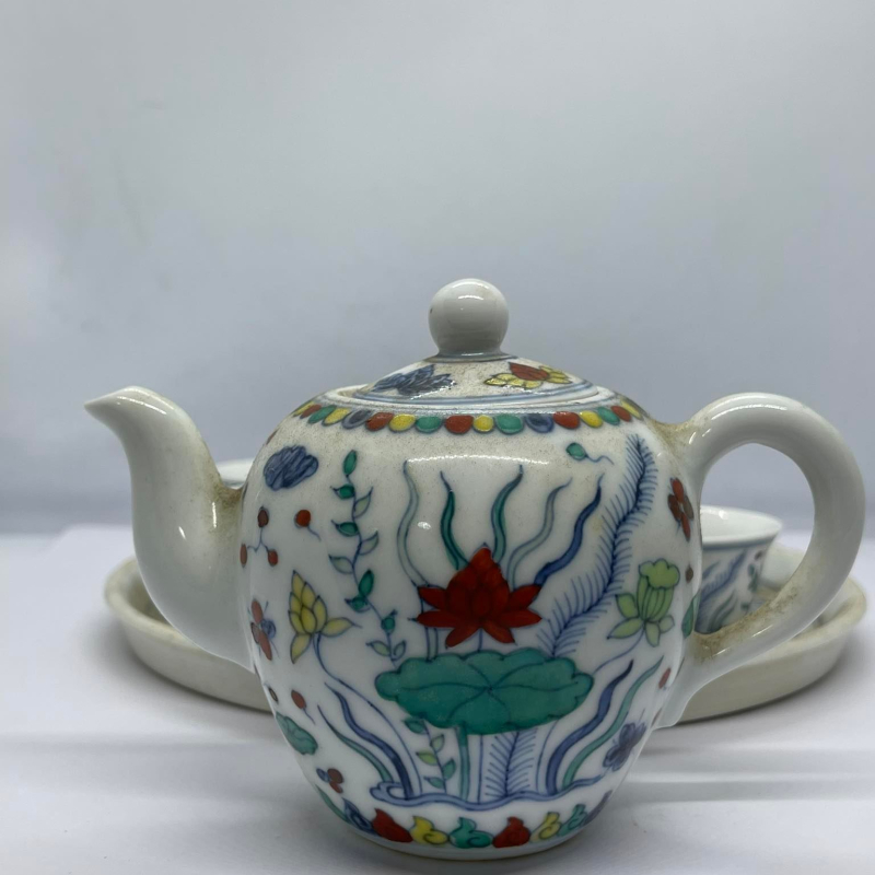 ชุดกาน้ำชากระเบื้องจีน ชุดนี้มี เป็นชุดกาน้ำชาจีนโบราณ ระบุผลิตในสมัยจักรพรรดิ์เฉินฮว่า จักรพรรดิ์องค์ที่ 9 แห่งราชวงศ์หมิง พื้นกระเบื้องมีสีขาว ลวดลายดอกบัวสีแดง และเหลือง พร้อมกล่องสวยงาม