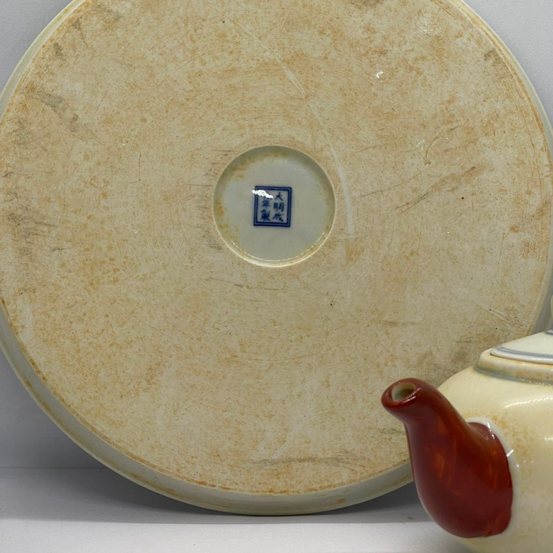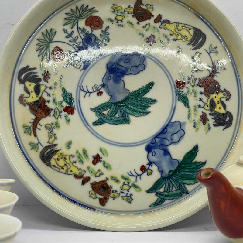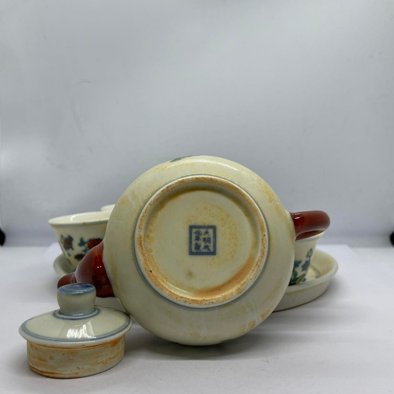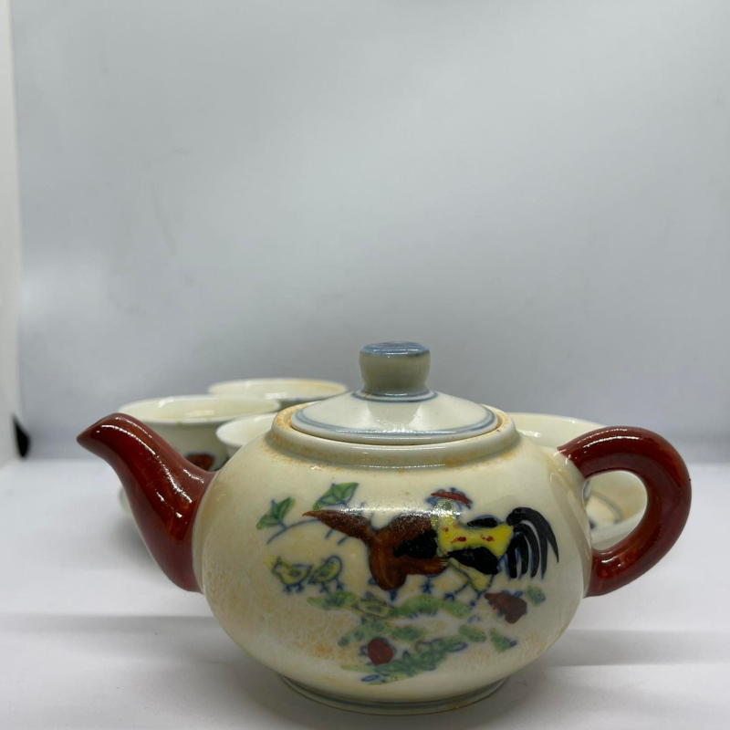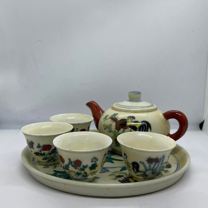ชุดกาน้ำชากระเบื้องจีน ชุดนี้มี เป็นชุดกาน้ำชาจีนโบราณ ระบุผลิตในสมัยจักรพรรดิ์เฉินฮว่า จักรพรรดิ์องค์ที่ 9 แห่งราชวงศ์หมิง พื้นกระเบื้องมีสีขาว หูและปากสีแดงน้ำตาล ลวดลายพ่อไก่ แม่ไก่ และลูกไก่กำลังหากินอยู่บนพื้นดิน  พร้อมกล่องสวยงาม