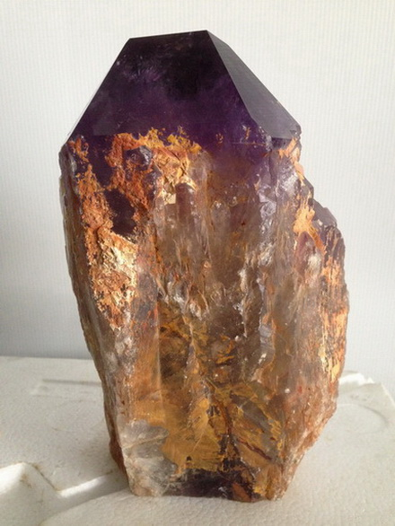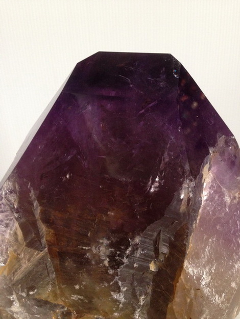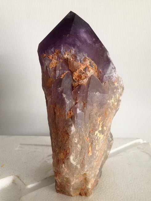 ผลึกอเมทีสต์ นี้มีสีม่วงสด ขนาดกว้าง 132 มม. หนา 88 มม. สูง 200 มม. น้ำหนัก 3,175 กรัม