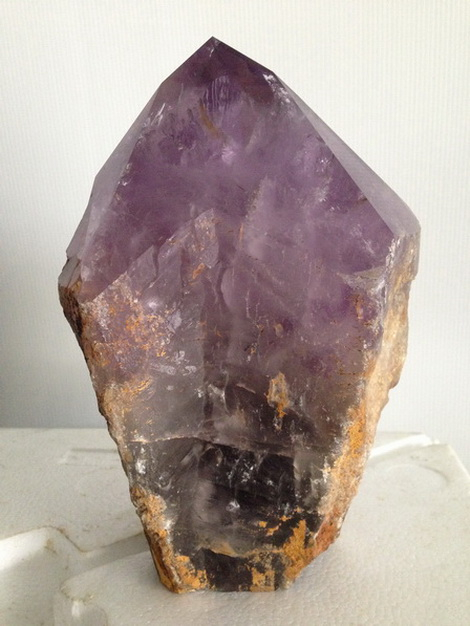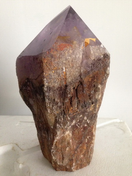 ผลึกอเมทีสต์ นี้มีสีม่วงสด ขนาดกว้าง 135 มม. หนา 120 มม. สูง 115 มม. น้ำหนัก 3,835 กรัม