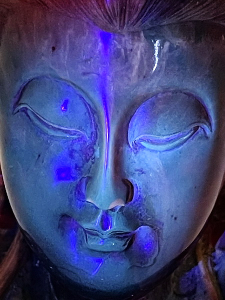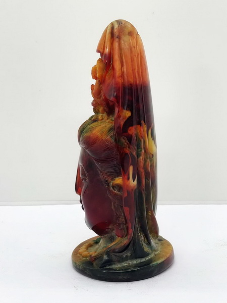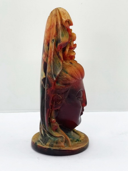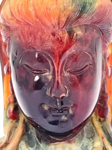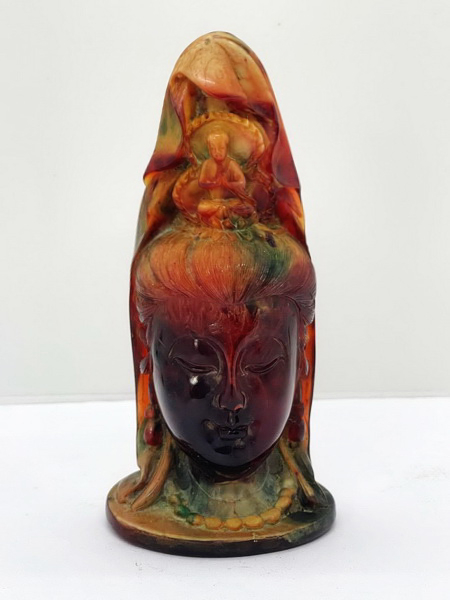 องค์เจ้าแม่กวนอิมนี้ แกะมาจากอำพันพม่า เป็นส่วนพระเศียรของเจ้าแม่ฯ และมีพระพุทธเจ้าประทับบนเกล้าผมเจ้าแม่ฯ ลวดลายสีสรร งดงามมาก งานแกะปราณีต องค์ขนาดกว้าง 64.82 มม. ยาว 72.43 มม. สูง 1501.71 มม. อำพันแท้เมื่อถูกแสงอินฟาเรดแสงจะสะท้อนกลับ