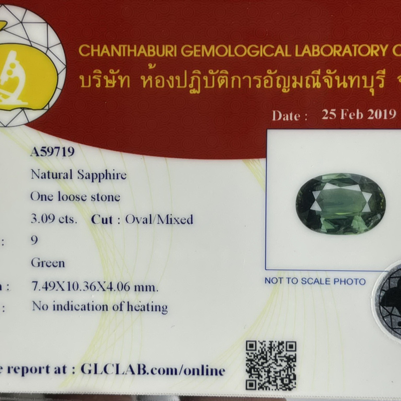 พลอยเขียวส่อง เม็ดนี้ เป็นพลอยธรรมชาติจากจันทบุรี เป็นพลอยดิบ ไม่ผ่านการปรับปรุงคุณภาพใดๆ ทั้งสิ้น หายาก เนื้อพลอยใสสะอาดสวย มีไฟ มีขนาดกว้าง 7.49 มม. ยาว 10.36 มม. หนา 4.06 มม. น้ำหนัก 3.09 กะรัต มีมาพร้อมกับใบเซอร์รับรองจาก บ.ห้องปฎิบัติการอัญมณีจันทบุรี จำกัด