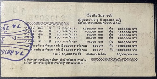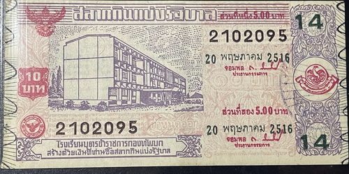 ลอตเตอรี่สะสม สลากกินแบ่งรัฐบาล ชุดที่ 14 งวดวันที่ 20 พฤษาคม พ.ศ.2516 ราคาหน้าใบ 10 บาท หมายเลข 2102095 ลายเซ็น จอมพลถนอม กิตติขจร (ประธานกรรมการ)