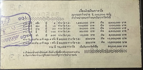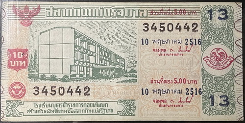 ลอตเตอรี่สะสม สลากกินแบ่งรัฐบาล ชุดที่ 13 งวดวันที่ 10 พฤษาคม พ.ศ.2516 ราคาหน้าใบ 10 บาท หมายเลข 3450442 ลายเซ็น จอมพลถนอม กิตติขจร (ประธานกรรมการ)