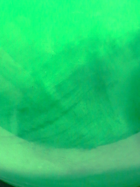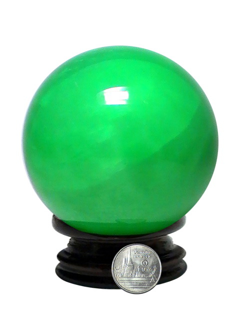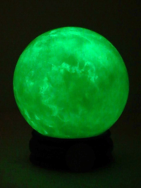 ลูกแก้วฟลูออไรต์เรืองแสงนี้ สีเขียว สามารถเรืองแสงได้ในที่มืด มีขนาดเส้นผ่าศูนย์กลาง 4 นิ้ว