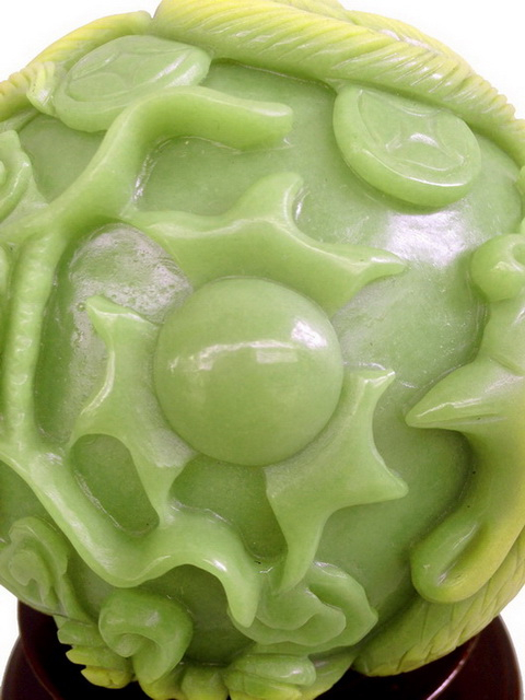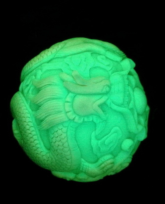 ลูกแก้วมังกรหงษ์นี้ แกะจากหยกเรืองแสง แกะเป็นรูปมังกรและหงษ์เล่นลูกแก้วไฟ ด้านหลังเป็นรูปเหรียญจีนโบราณ และใบบัว แสดงถึงความมั่งมี ร่ำรวย อุดมสมบูรณ์ มีขนาดเส้นผ่าศูนย์กลาง 5 นิ้ว