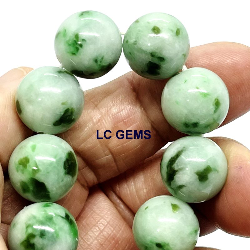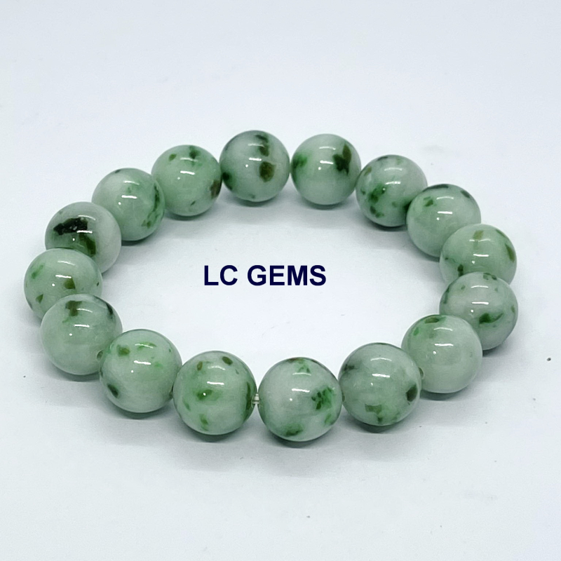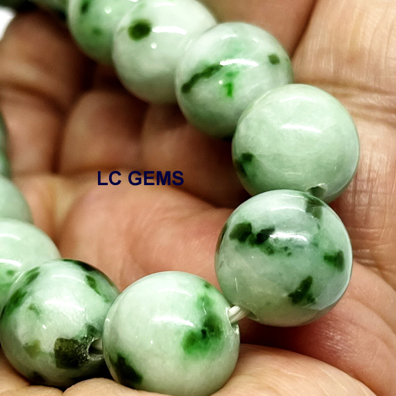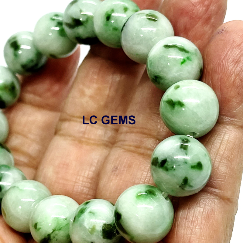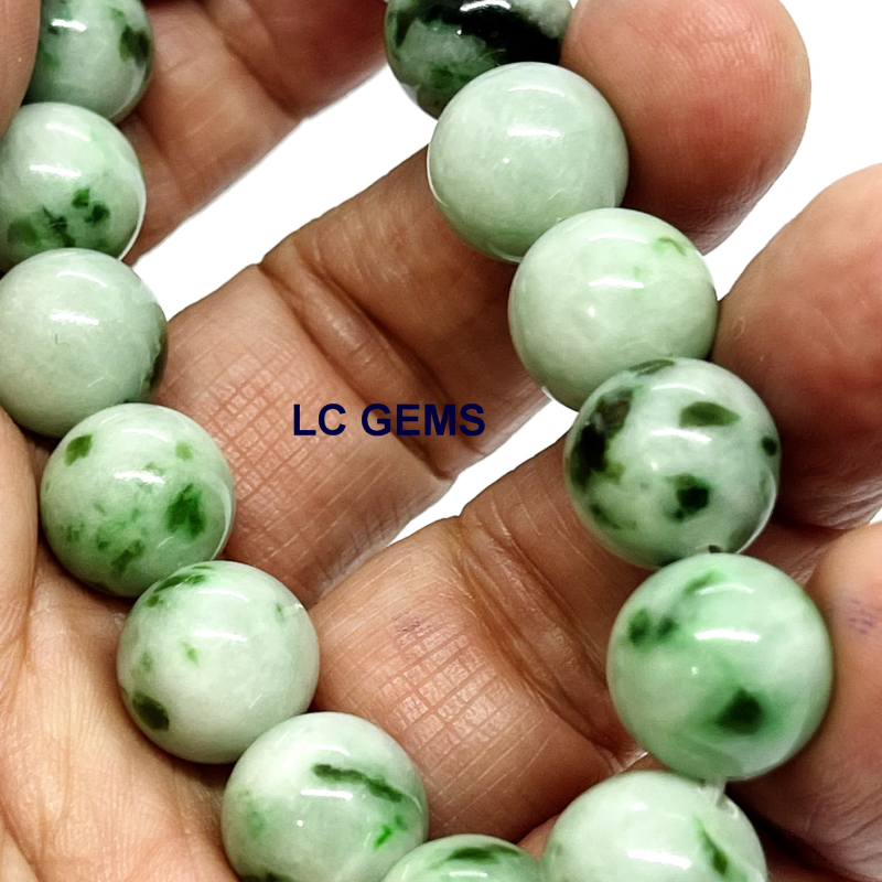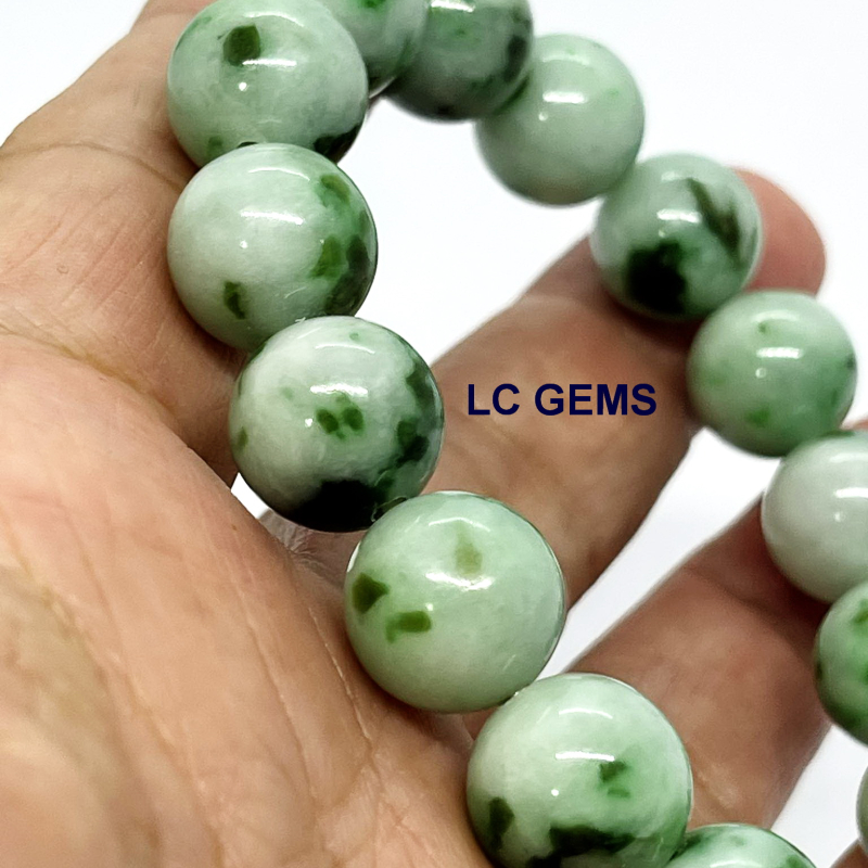 สร้อยข้อมือหยกพม่า เส้นนี้ ประกอบด้วยลูกปัดหยกพม่า เจไดต์ Type A พื้นหยกสีเขียวกรีนแอ๊ปเปิ้ล แต้มด้วยน้ำหยกเอเวอร์กรีน มอส อิน สโนว์ เนื้อหยกคุณภาพเกรดพรีเมี่ยม เนื้อหยกมันเงา ลูกใหญ่พิเศษ ขนาดเม็ดเส้นผ่าศูนย์กลาง 13.36 มม. ใช้เอ็นยึดเกาหลีอย่างดี
