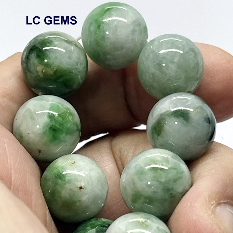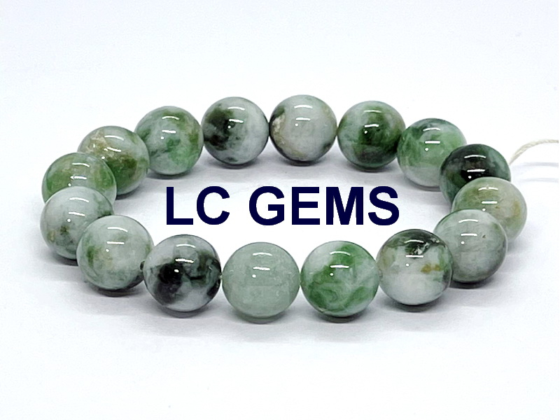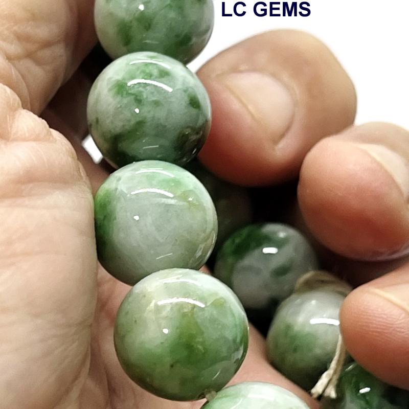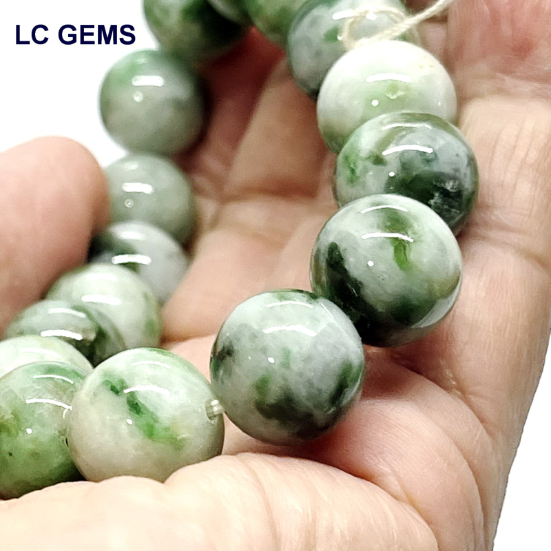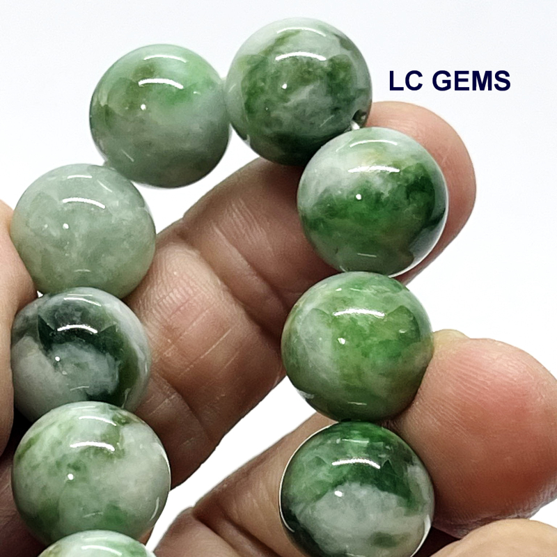 สร้อยข้อมือหยกพม่า เส้นนี้ ประกอบด้วยลูกปัดหยกพม่า เจไดต์ Type A พื้นหยกสีขาวแต้มด้วยหยกสีเขียว มอส อิน สโนว์ เนื้อหยกคุณภาพเกรดพรีเมี่ยม เนื้อหยกมันเงา ขนาดเม็ดเส้นผ่าศูนย์กลาง 13.51 มม. ใช้เอ็นยึดเกาหลีอย่างดี