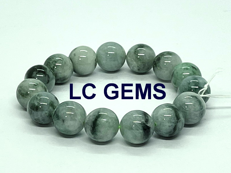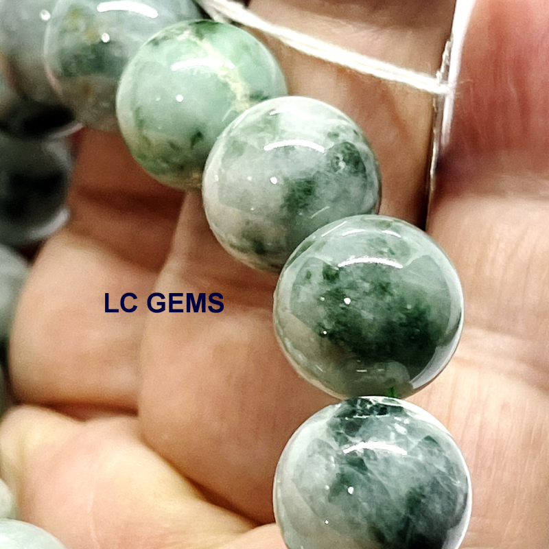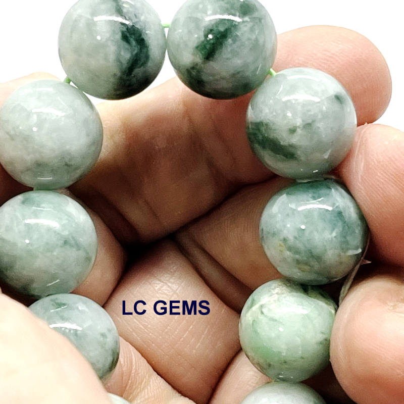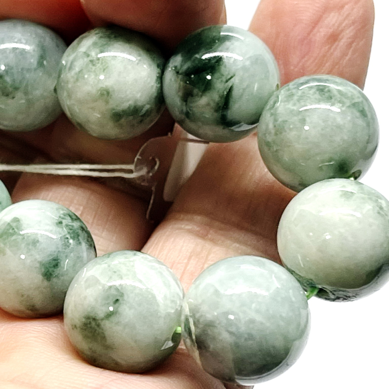 สร้อยข้อมือหยกพม่า เส้นนี้ ประกอบด้วยลูกปัดหยกพม่า เจไดต์ Type A พื้นหยกสีขาวแต้มด้วยหยกสีเขียว มอส อิน สโนว์ เนื้อหยกคุณภาพเกรดพรีเมี่ยม เนื้อหยกมันเงา ขนาดเม็ดเส้นผ่าศูนย์กลาง 13.51 มม. ใช้เอ็นยึดเกาหลีอย่างดี