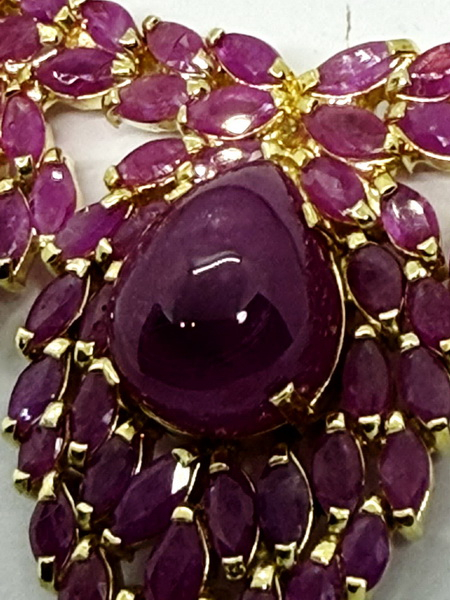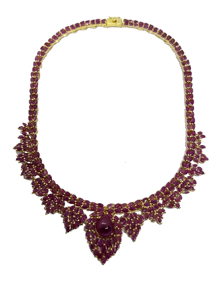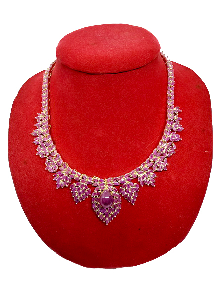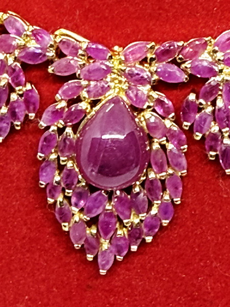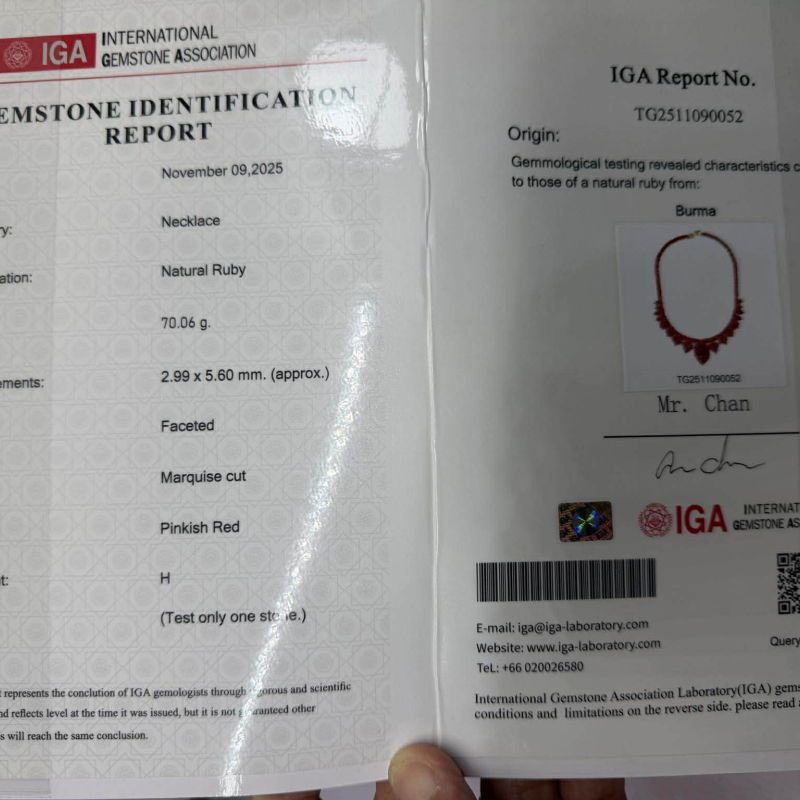 สร้อยคอทับทิมพม่า ชุดนี้ เป็นพลอยทับทิมเผาเก่า สีแดงชมพู เนื้อแก้ว จากประเทศพม่า พลอยเจียรมาร์คีส์ จำนวน 250 เม็ดๆ มีขนาดกว้าง 2.99 มม. สูง 5.60 มม. และเม็ดล่างใหญ่ทรงหยดน้ำขนาดกว้าง 11.5 มม. สูง 13.6 มม. น้ำหนักทั้งเส้นรวม 70.06 กรัม ตัวเรือนสร้อยเป็นเงินถมทอง มีใบเซอร์รับประกันพลอยแท้จากสถาบัน IGA INTERNATIONAL GEMSTONE ASSOCIATION IGA Report No. TG2511090052