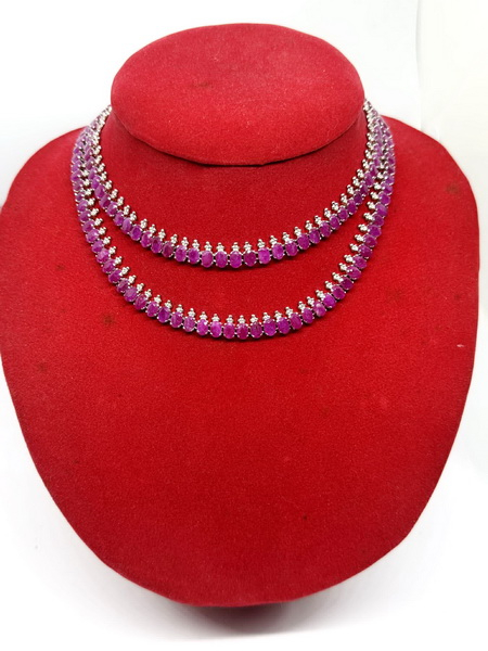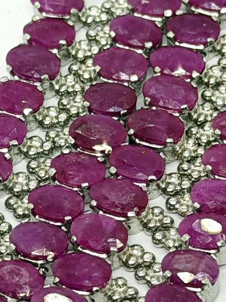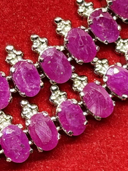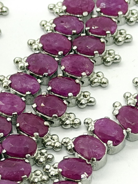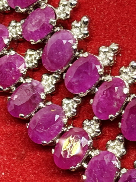 สร้อยคอทับทิมพม่า ชุดนี้ เป็นพลอยทับทิมเผาเก่า สีแดงชมพู เนื้อแก้ว จากประเทศพม่า พลอยเจียรเหลี่ยมไข่ มีขนาดประมาณ 4.05x5.89 มม. สร้อยยาวประมาณ 80 ซ.ม. น้ำหนักทั้งเส้นรวม 69.43 กรัม ตัวเรือนสร้อยเป็นเงิน มีใบเซอร์รับประกันพลอยแท้จากสถาบัน IGA INTERNATIONAL GEMSTONE ASSOCIATION IGA Report No. TG2511070033