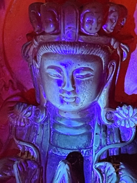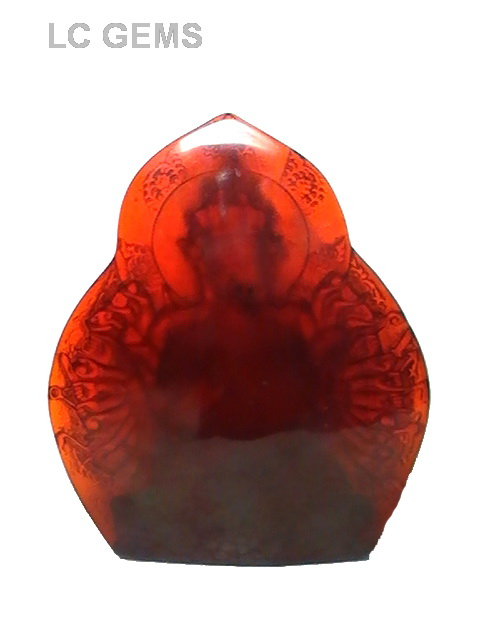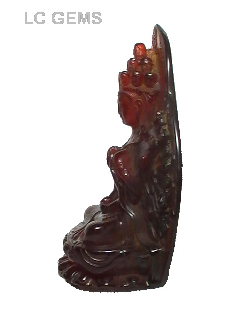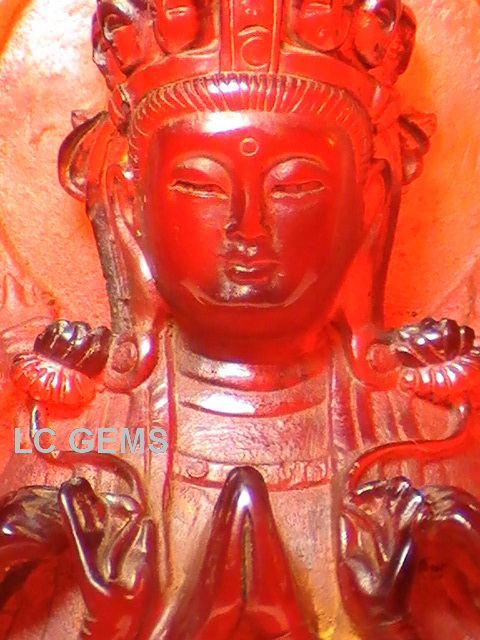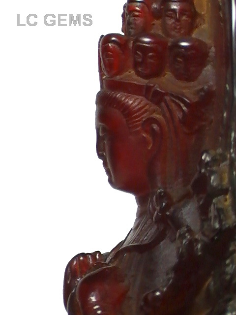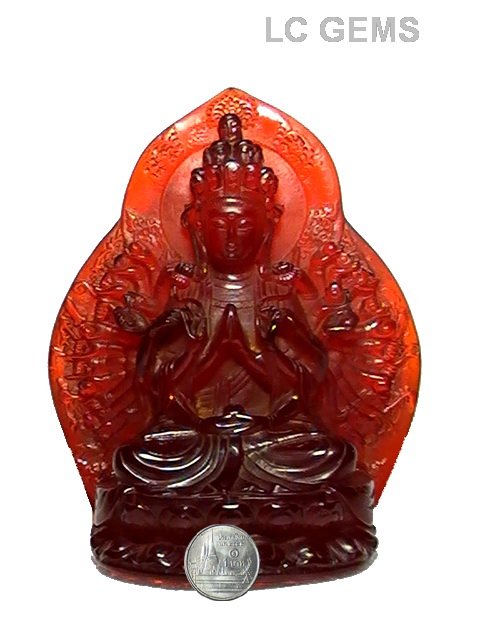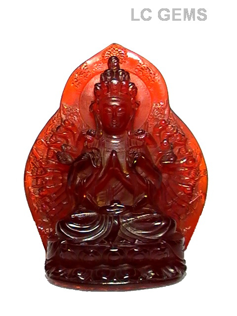 องค์เจ้าแม่กวนอิมพันมือนี้ แกะมาจากแท่งอำพันพม่า เป็นปางพันมือ-นั่ง ลวดลายสีสรร งดงามมาก งานแกะปราณีต องค์ขนาดกว้าง 120 มม. สูง 150 มม. หนา 65 มม. อำพันแท้เมื่อถูกแสงอินฟาเรดแสงจะสะท้อนกลับ