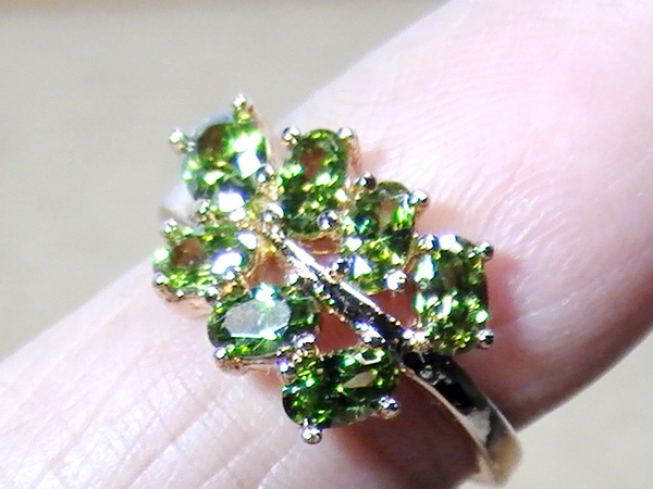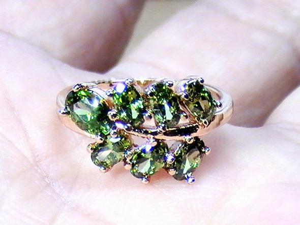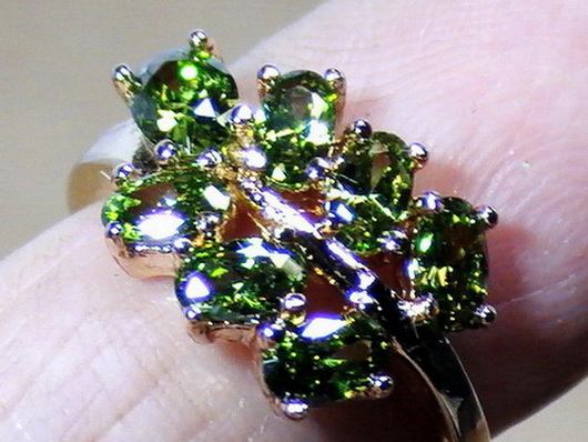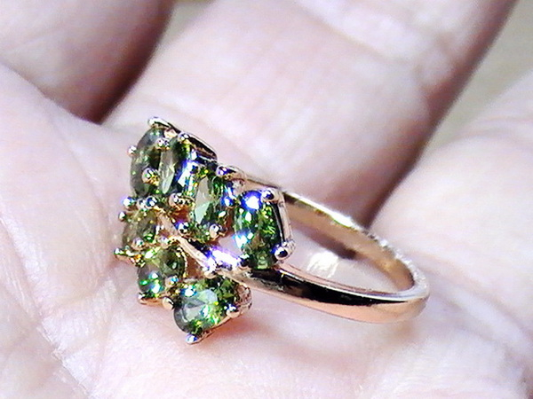 แหวนพลอยมณีใต้น้ำสีเขียว วงนี้ ประกอบด้วยพลอยมณีใต้น้ำ หรือ เพชรพญานาค สีเขียวมรกตใส จำนวน 7 เม็ด เรียงกันเหมือนใบไม้ พลอยทุกเม็ดสู้ไฟ มีประกายสวยงาม ตัวเรือนทำจากโลหะกระไหล่ทอง ไม่ลอกไม่ดำ หัวแหวนมีขนาดกว้าง 11 มม. ยาว 17 มม. เส้นผ่าศูนย์กลางภายในวงแหวน 17 มม. หรือ Size 53