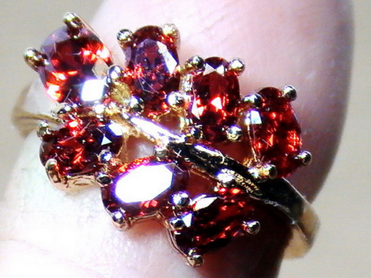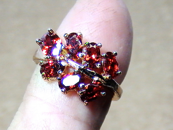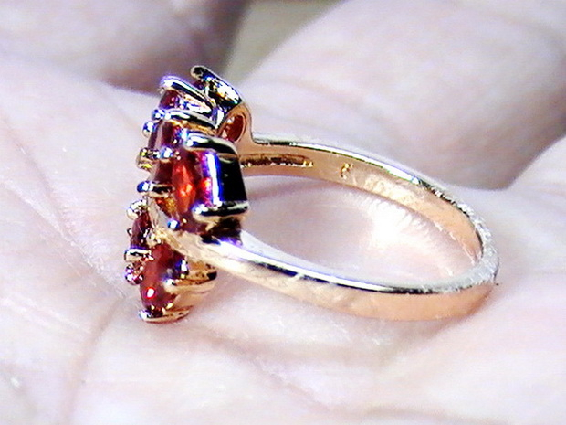แหวนพลอยมณีใต้น้ำสีเขียว วงนี้ ประกอบด้วยพลอยมณีใต้น้ำ หรือ เพชรพญานาค สีแดงทับทิมใส จำนวน 7 เม็ด เรียงกันเหมือนใบไม้ พลอยทุกเม็ดสู้ไฟ มีประกายสวยงาม ตัวเรือนทำจากโลหะกระไหล่ทอง ไม่ลอกไม่ดำ หัวแหวนมีขนาดกว้าง 11 มม. ยาว 17 มม. เส้นผ่าศูนย์กลางภายในวงแหวน 16 มม. หรือ Size 50