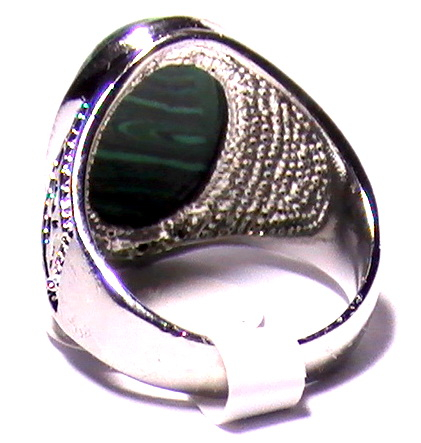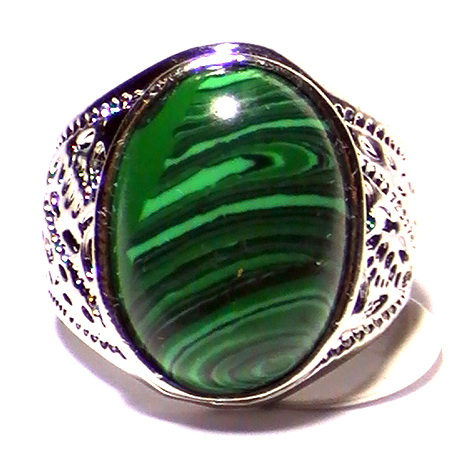 แหวนมาลาไคต์ วงนี้ ประกอบด้วยหัวแหวนหินมาลาไคต์ สีขีเยวลายสวย หัวแหวนมีขนาด 12x14 มม. ตัวเรือนทำจากทองแดงชุปทองขาว เส้นผ่าศูนย์กลางวงในแหวน 18-20 มม.