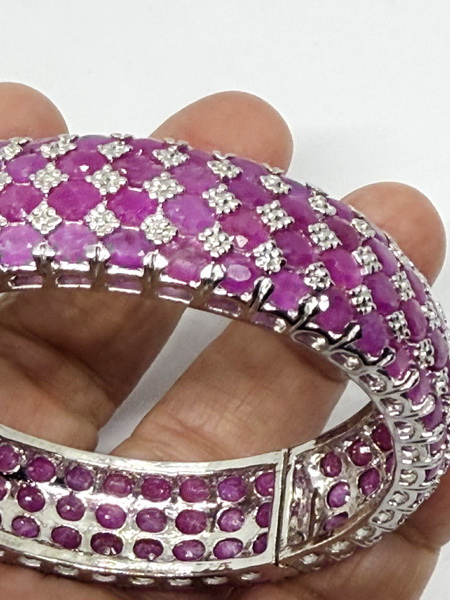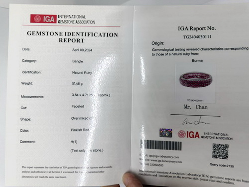 กำไลทับทิมพม่าวงนี้ นำเข้าจากประเทศพม่า กำไลนี้ประกอบด้วยพลอยทับทิมพม่าเผาเก่า พลอยมีขนาดกว้าง 3.84 มม. ยาว 4.71 มม. ตัวเรือนมีขนาดหน้ากว้าง 15.6 มม. หนา 7 มม. เส้นผ่าศูนย์กลาง 58.6 มม. ตัวเรือนกำไลเป็นเงิน สามารถปรับปิดเปิดได้ มีใบเซอร์รับประกันพลอยแท้จากสถาบัน IGA INTERNATIONAL GEMSTONE ASSOCIATION IGA Report No. TG2404030111