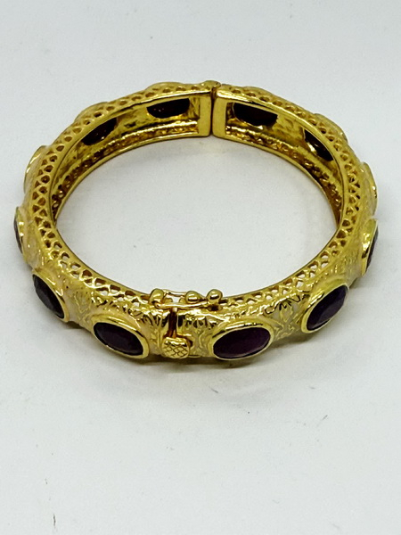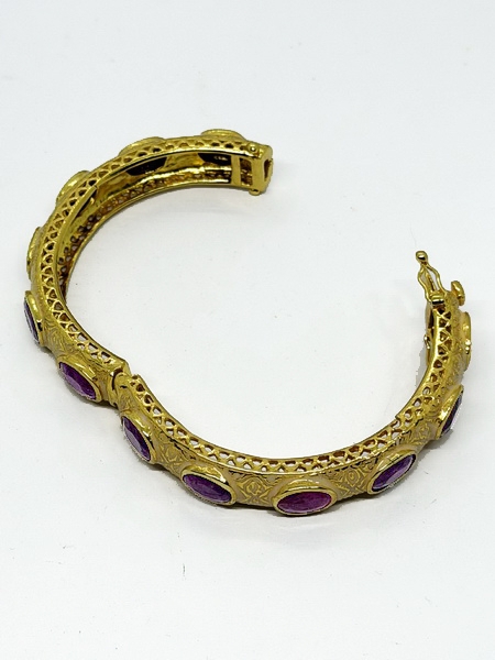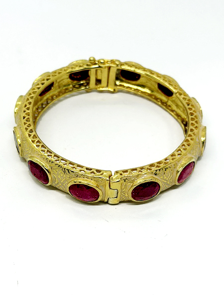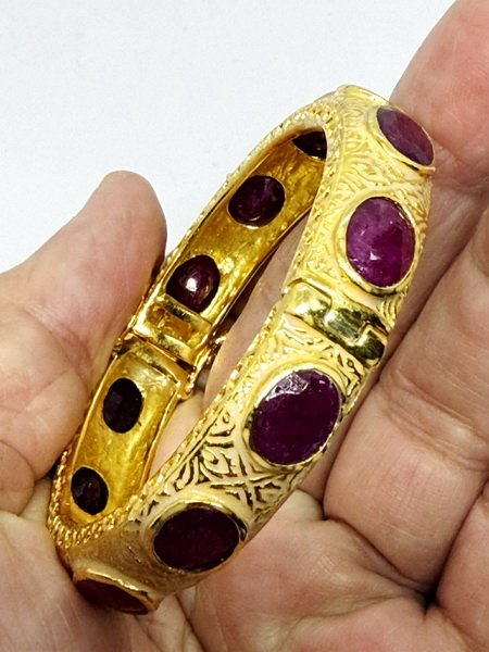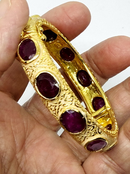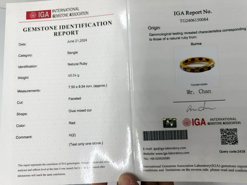 กำไลทับทิมพม่าวงนี้ นำเข้าจากประเทศพม่า กำไลนี้ประกอบด้วยพลอยทับทิมพม่าเผาเก่า พลอยมีขนาดกว้าง 7.50 มม. ยาว 9.54 มม. ตัวเรือนมีขนาดหน้ากว้าง 11.8 มม. หนา 7.8 มม. เส้นผ่าศูนย์กลาง 54.7 มม. ตัวเรือนกำไลเป็นเงิน 925 ถมทอง สามารถปรับปิดเปิดได้ มีใบเซอร์รับประกันพลอยแท้จากสถาบัน IGA INTERNATIONAL GEMSTONE ASSOCIATION IGA Report No. TG2406150084