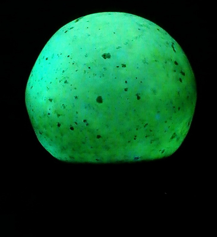 ก้อนหยกเรืองแสงนี้ เป็นหยกสีเขียวตองอ่อน สามารถเรืองแสงได้ในที่มืด มีขนาดกว้าง 50 มม. น้ำหนัก 254 กรัม