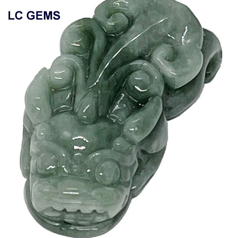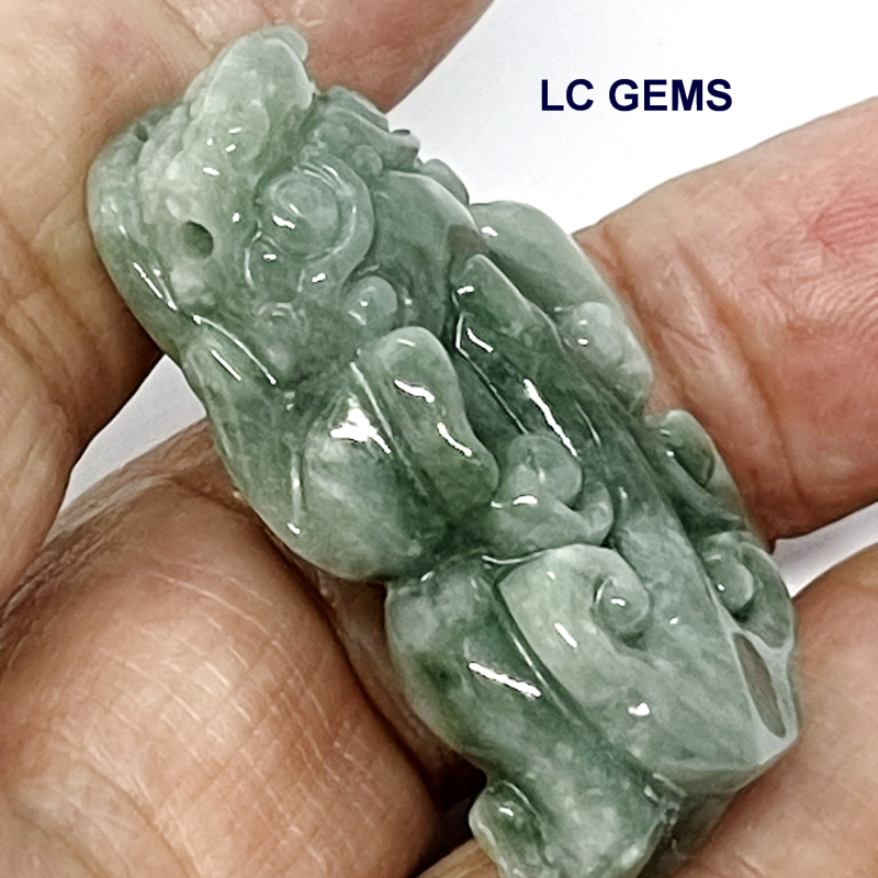 ปีเซียะ ชิ้นนี้ แกะจากหยกพม่าเกรดพรีเมี่ยมสีเขียวอมฟ้า เนื้อวุ้นเงางาม แสงลอดได้ เป็นหยกเจไดต์ Type A มีขนาดกว้าง 22.88 มม. ยาว 43.22 มม. สูง 10.96 มม.