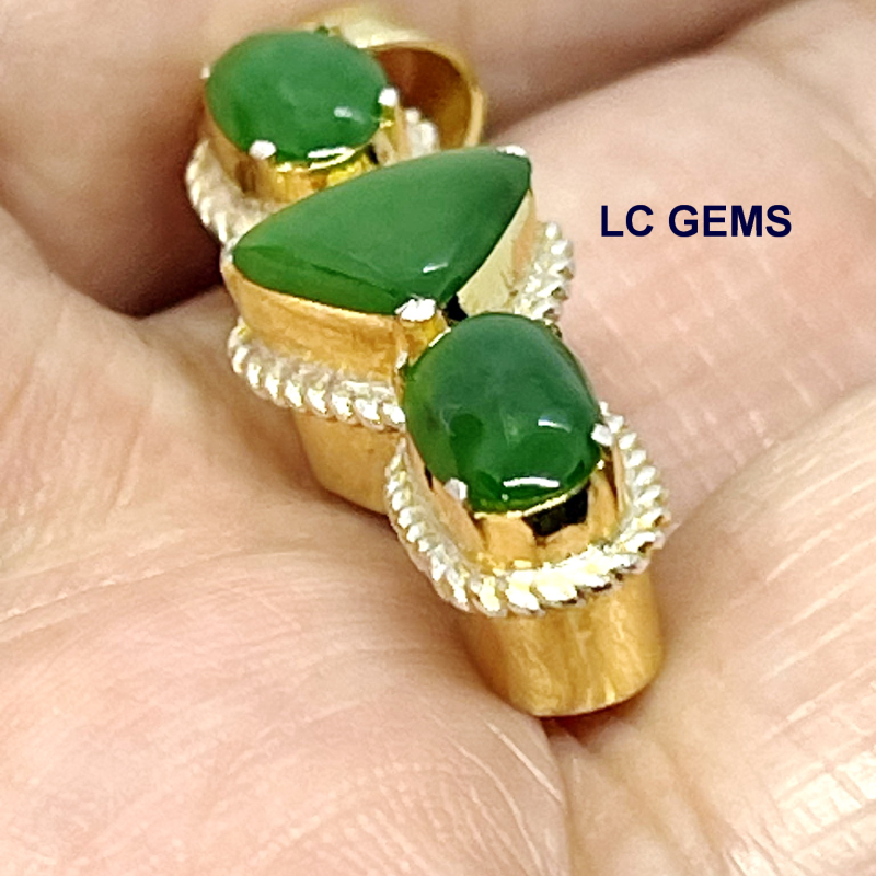 จี้หยกพม่า ชิ้นนี้ เป็นหยกพม่าเนื้อสีเขียวจักรพรรดิ์ เจไดต์ Type A ประกอบด้วยเม็ดหยกรี 2 เม็ด และทรง3เหลี่ยม 1 เม็ด (เม็ดกลาง) น้ำหนักประมาณ 1 กะรัตต่อเม็ด ตัวเรือนโลหะลำลอง ขนาดกว้าง 1037 มม. ยาว 32.90 มม. หนา 8.73 มม.