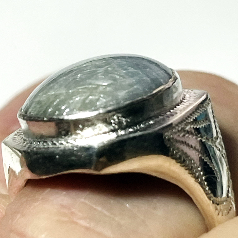 แหวนพลอยไพลิน วงนี้ เป็นพลอยไพลินดิบสีน้ำเงินอ่อนจากพม่า ไม่ผ่านปรับปรุงคุณภาพใดๆ มีเหลือบ ทรงรีหลังเบี้ย ขนาดกว้าง 13.7 มม. ยาว 16.3 มม. หนา 5.3 มม. ตัวเรือนเงิน 925 แกะลาย ชุบทองคำขาว ไซส์แหวน 20 มม. หรือ #62