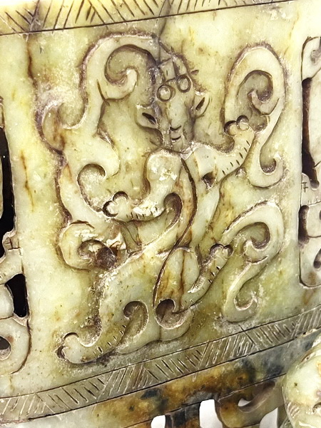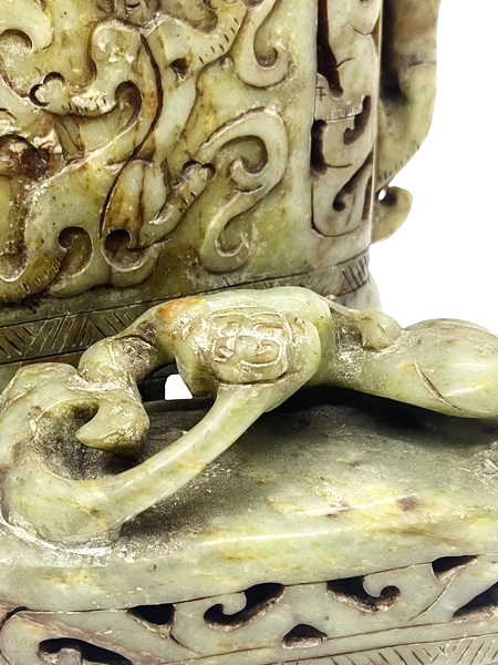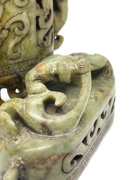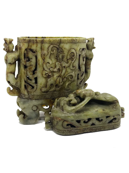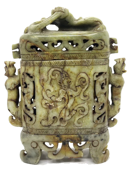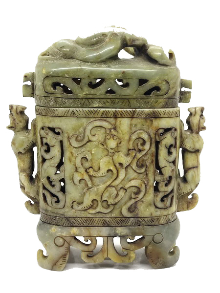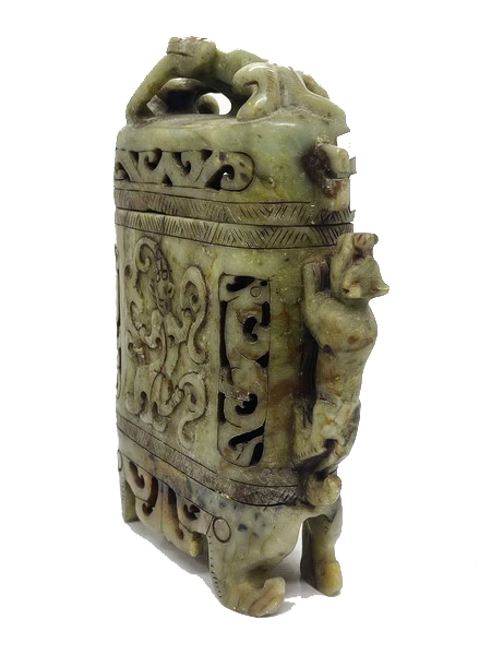 โถกำยานจีนหยกโบราณ ใบนี้ เป็นโถกำยานหยกเขียวของจีนโบราณ ราชวงศ์หมิง ทรงกระบอกแบน แกะลายเป็นปีเซียะ มีขนาดกว้าง 15 ซม. หนา 5.5 ซม. สูง 22 ซม.